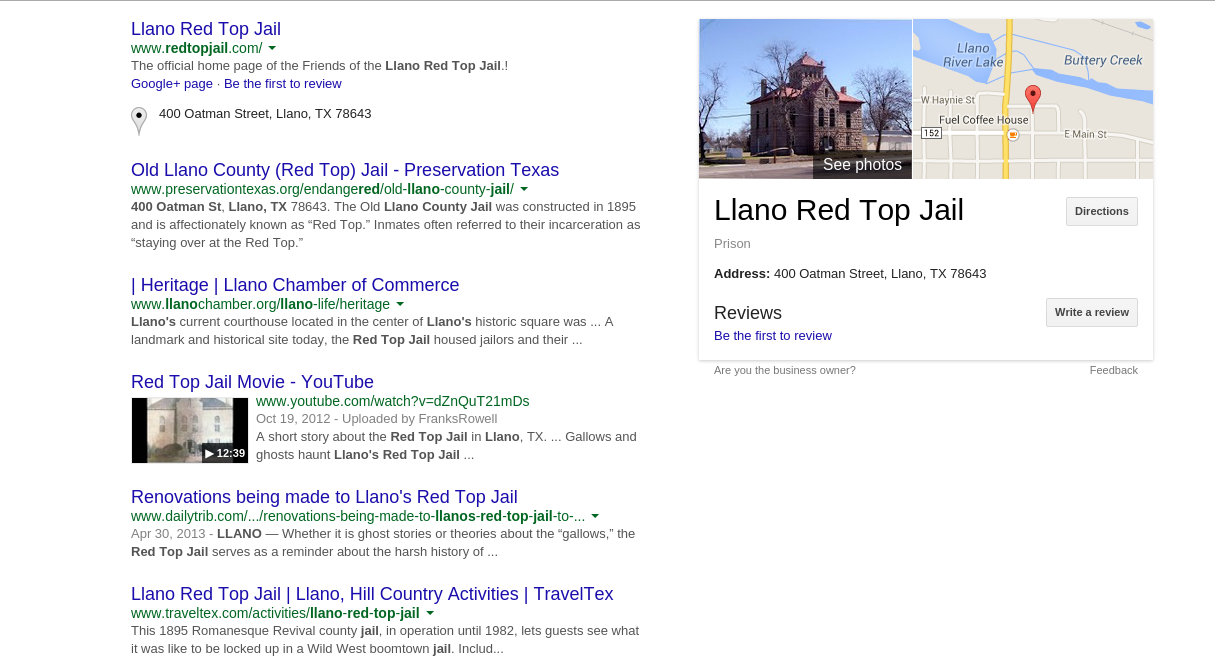 There are some real benefits to having a building, business, park, trail, neighborhood, etc. listed on Google Maps. Google indexes its own products first and so you have the Google Search engine knowing where to find it and displaying the information prominently. When you add a place and its information, hopefully including photos, you will get a search page that looks like this when you search for, say 'Red Top Jail':